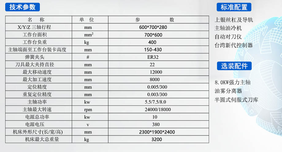 自動換刀系統(選配):本機可選裝自動換刀系統,該系統具備高速自動換刀功能,換刀速度快且刀庫容量大,能夠有效提升加工效率,節約人力成本。
